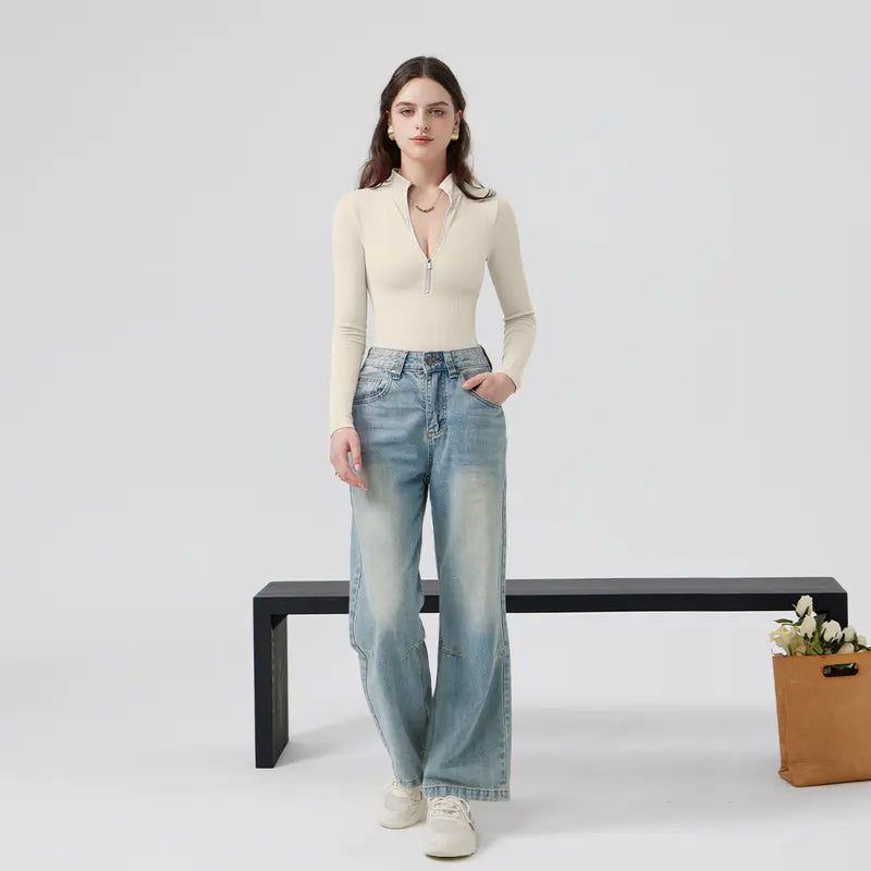 Bodysuits Sexy Ribbed One Piece Zip Front Long Sleeve Tops Bodysuits