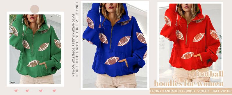 Game Day Sweatshirts Football Sequin Hoodies Tailgate Outfits Long Sleeve Zipper Sweaters with Pocket