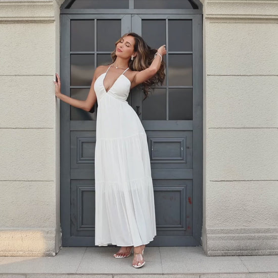 Maxi Beach Dress Boho Halter V Neck Backless Bow Dresses Flowy Trendy Ruffle Sundress for Women 2025